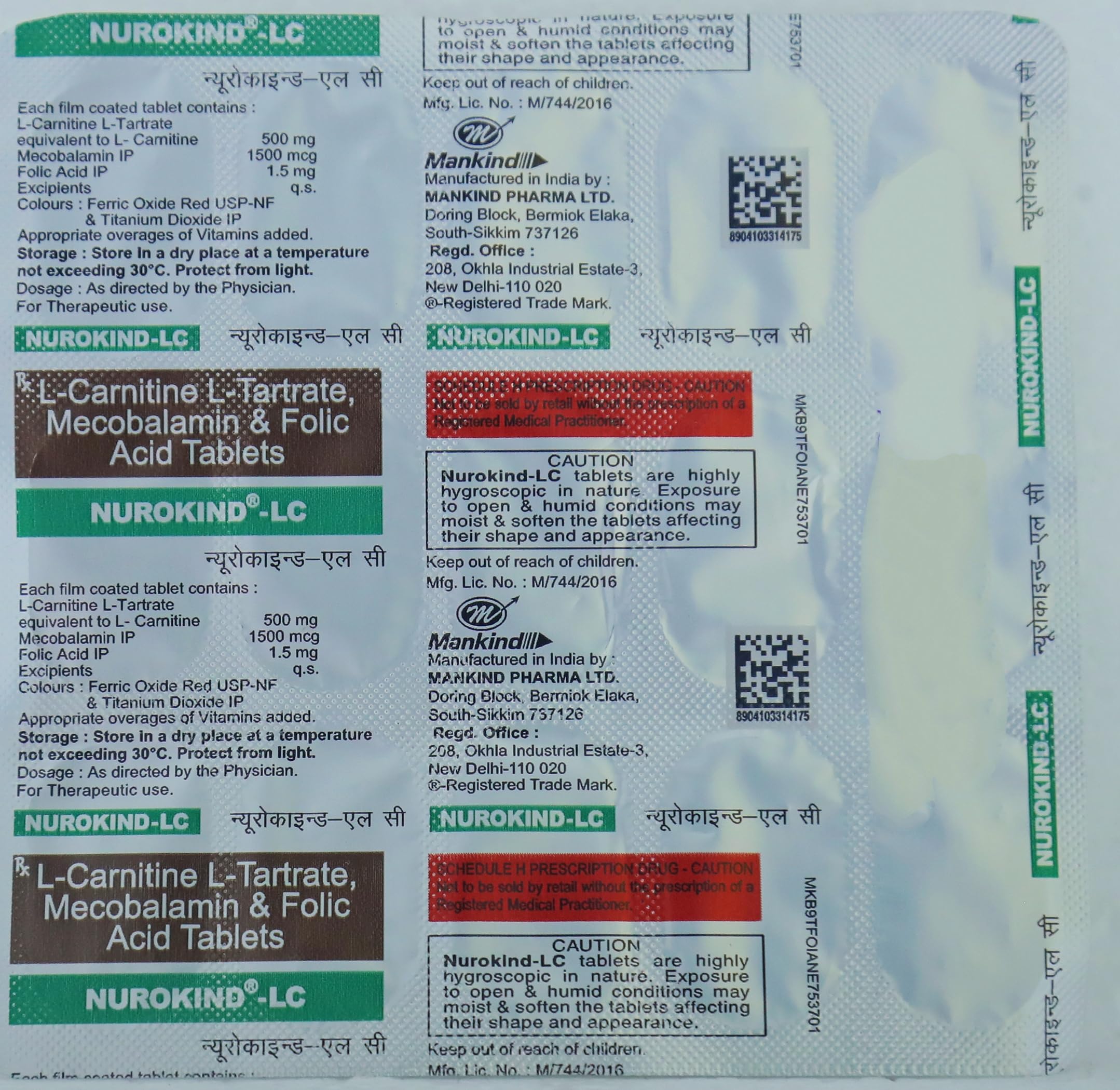Nurokind-LC Tablet 15's contains Folic acid, L-carnitine, and Methylcobalamin. Folic acid helps form red blood cells and prevents DNA changes that may lead to cancer. It prevents and treats low blood levels of folate (folate deficiency) and high blood levels of amino acid, homocysteine (hyperhomocysteinemia).