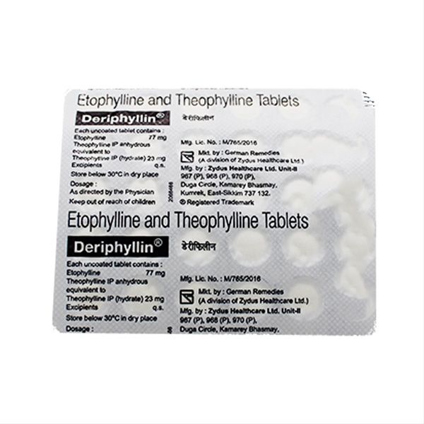 Deriphyllin Tablet 30's contains two bronchodilators namely, Theophylline and Etophylline used to treat symptoms of asthma and chronic obstructive pulmonary diseases (COPD). Deriphyllin Tablet 30's works by relaxing muscles and widening the airways of the lungs. Thus, it makes breathing easier.