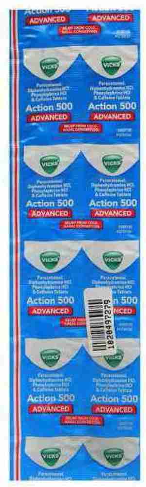Vicks Action 500 Advanced Tablet is a combination of four medicines: Paracetamol, Caffeine, Diphenhydramine, and Phenylephrine. This combination is helpful in relieving the symptoms of cold such as body ache, headache, fatigue, fever, watery eyes, sneezing, cough, sore throat, runny and stuffy nose.