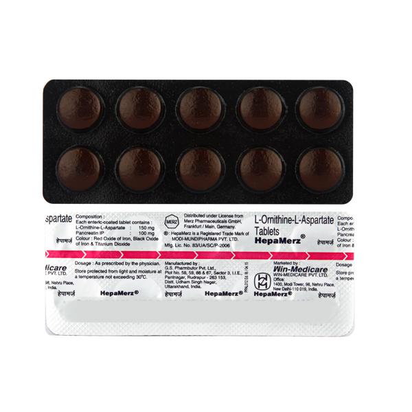 Hepamerz 150mg/100mg Tablet is a combination of two amino acids (L-Ornithine L-Aspartate) and a digestive enzyme (Pancreatin). L-Ornithine works by reducing blood ammonia levels. This helps the diseased liver carry out its function smoothly.