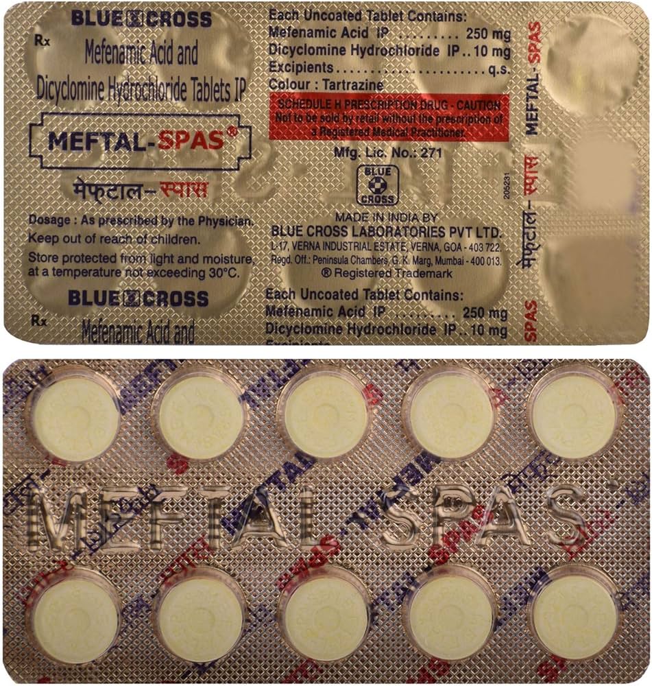 Meftal Spas composition includes two active salts namely dicyclomine hydrochloride and mefenamic acid in 1:25 ratio. Meftal Spas is sometimes prescribed alongside other medications for treating abdominal spasms of smooth muscles and menstrual pain and cramps.