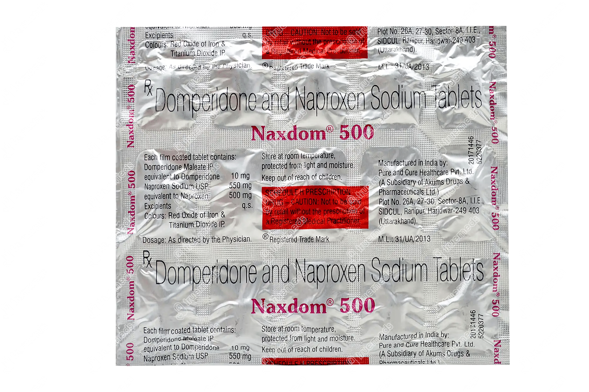 Naxdom 500 Tablet is a combination of two medicines: Naproxen and Domperidone. This combination helps in relieving the symptoms of migraine like headache, nausea and vomiting. Naproxen is a pain-killer that blocks the release of certain chemical messengers that cause headache