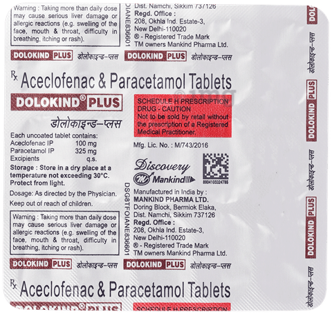 Dolokind Plus tablet is used to treat pain and inflammation of the joints and spinal cord. It also helps in relieving back pain, toothache, headache, muscle pain, period pain, etc. Dolokind Plus Tablet is a combination medicine containing aceclofenac and paracetamol as its main components