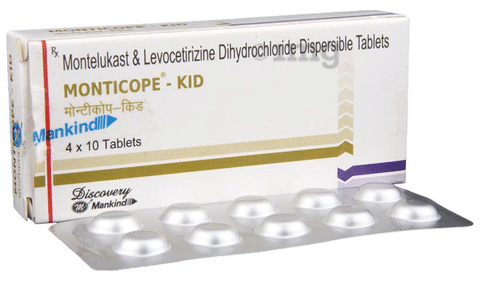Monticope -Kid Tablet DT contains Levocetirizine and Montelukast. Together these two relieve sneezing and runny nose caused due to allergies. Levocetirizine is an antiallergic that blocks a chemical messenger (histamine) responsible for runny nose, watery eyes, and sneezing. Montelukast is a leukotriene antagonist.