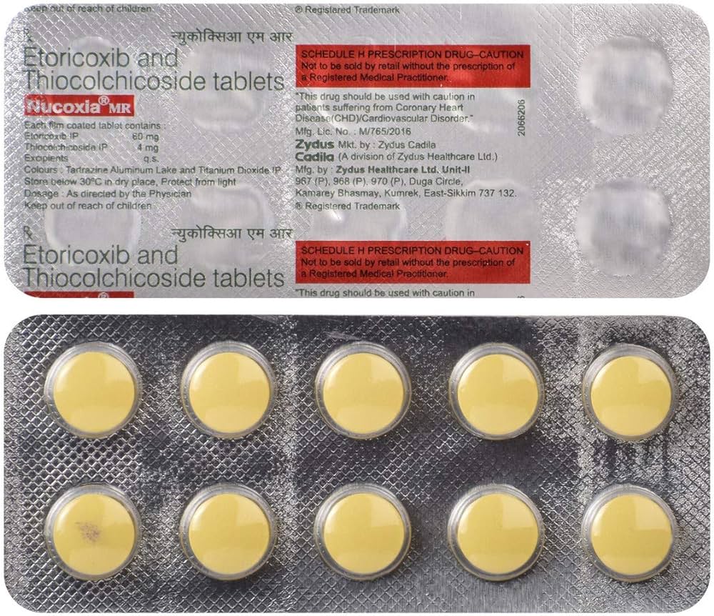 Nucoxia MR Tablet 10's is a combination of two drugs: Etoricoxib (Non-Steroidal Anti-Inflammatory Drugs) and Thiocolchicoside (Muscle relaxant). Nucoxia MR Tablet 10's is used for the treatment of osteoarthritis, rheumatoid arthritis, gout, ankylosing spondylitis, acute pain, chronic low back pain and muscle spasms.