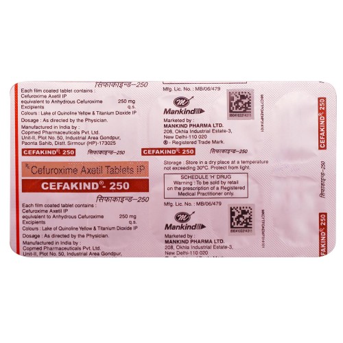 Cefakind 250 MG Tablet is an antibiotic medicine that contains cefuroxime. It is used to treat bacterial infections of the lungs, nose, throat, ears, skin, bladder, etc. It is also used to treat a sexually transmitted disease caused by Neisseria gonorrhoea bacteria that infects both men and women.