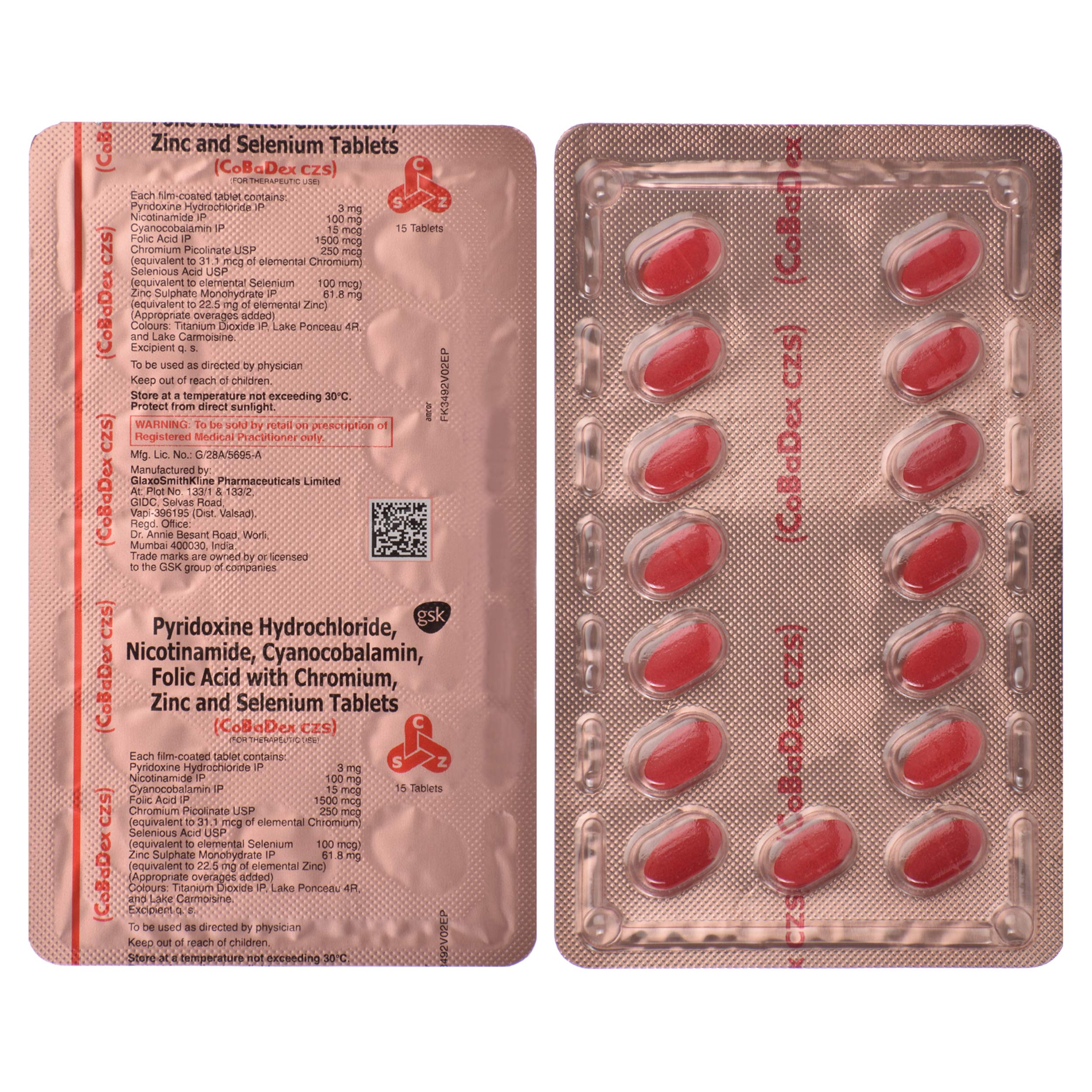 Cobadex CZS tablet contains Pyridoxine (Vitamin B6), Selenium, Chromium, Nicotinamide, Zinc, Cyanocobalamin (Vitamin B12) and Folic Acid (Vitamin B9). Pyridoxine or Vitamin B6: It helps to improve metabolism along with the maintenance of the nervous and immune system.