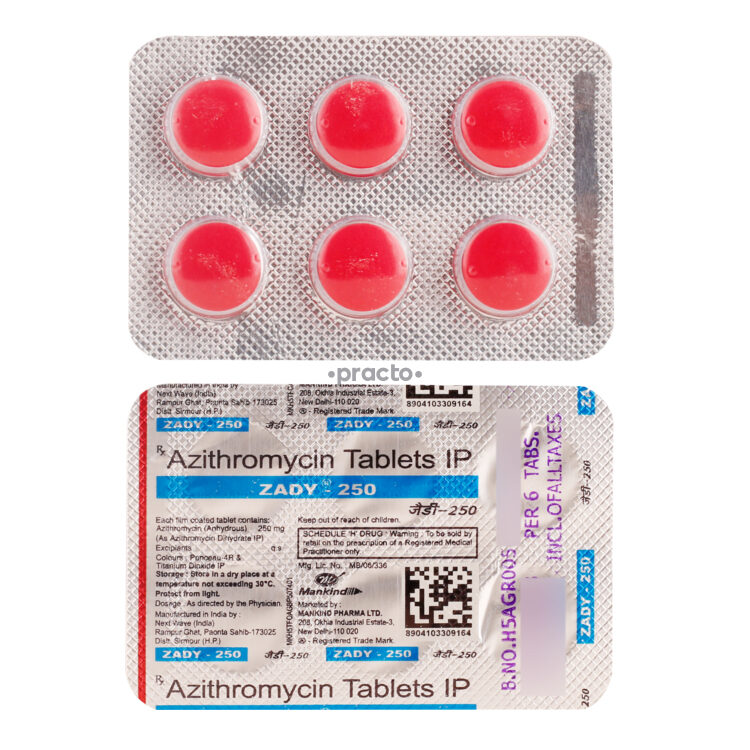 Zady 250 Tablet is an antibiotic used to treat various types of bacterial infections of the respiratory tract, ear, nose, throat, lungs, skin, and eye in adults and children. It is also effective in typhoid fever and some sexually transmitted diseases like gonorrhea.