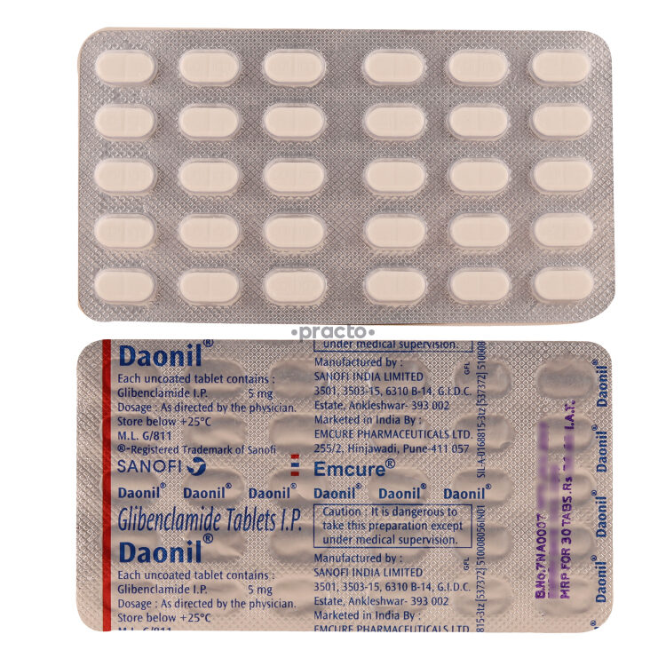 Daonil Tablet is a medicine used to treat type 2 diabetes mellitus in adults. It belongs to a group of medicines called sulfonylureas and helps control blood sugar levels in people with diabetes. This helps to prevent serious complications of diabetes like kidney damage and blindness.