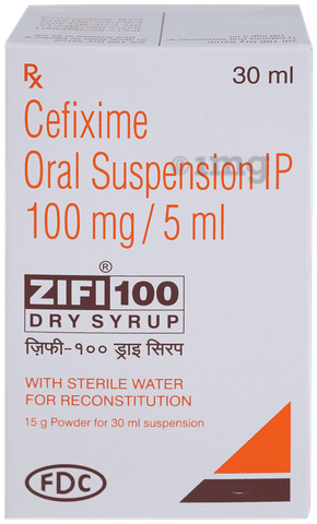 ZIFI 100MG DRY SYRUP contains Cefixime which belongs to the group of medicines called Antibiotics. It is used to treat bacterial infections of the ear, nose, throat, sinus, respiratory tract (bronchus, lungs), urinary tract, genital tract and biliary tract in children (aged between 6 months up to 12 years).