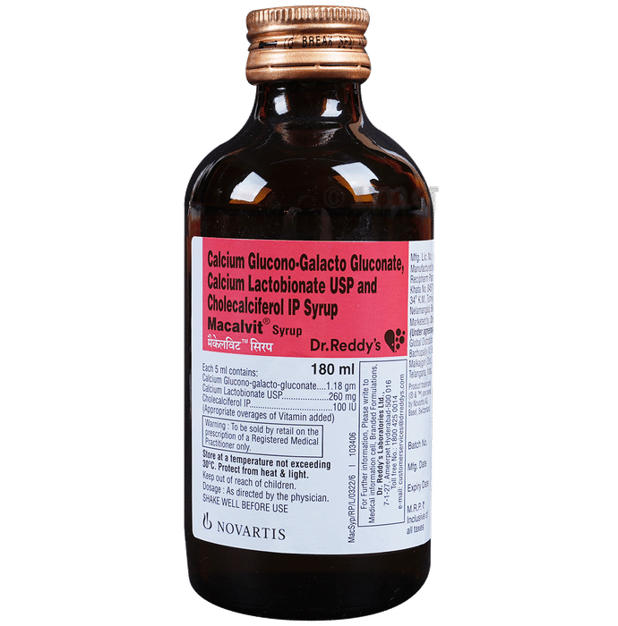 Macalvit Syrup is a dietary supplement formulated to support bone and joint health. It contains essential ingredients like calcium glucono-galacto-gluconate, calcium lactobionate, and cholecalciferol (vitamin D3), which are crucial for the normal functioning of nerves, bones, cells, and muscles.